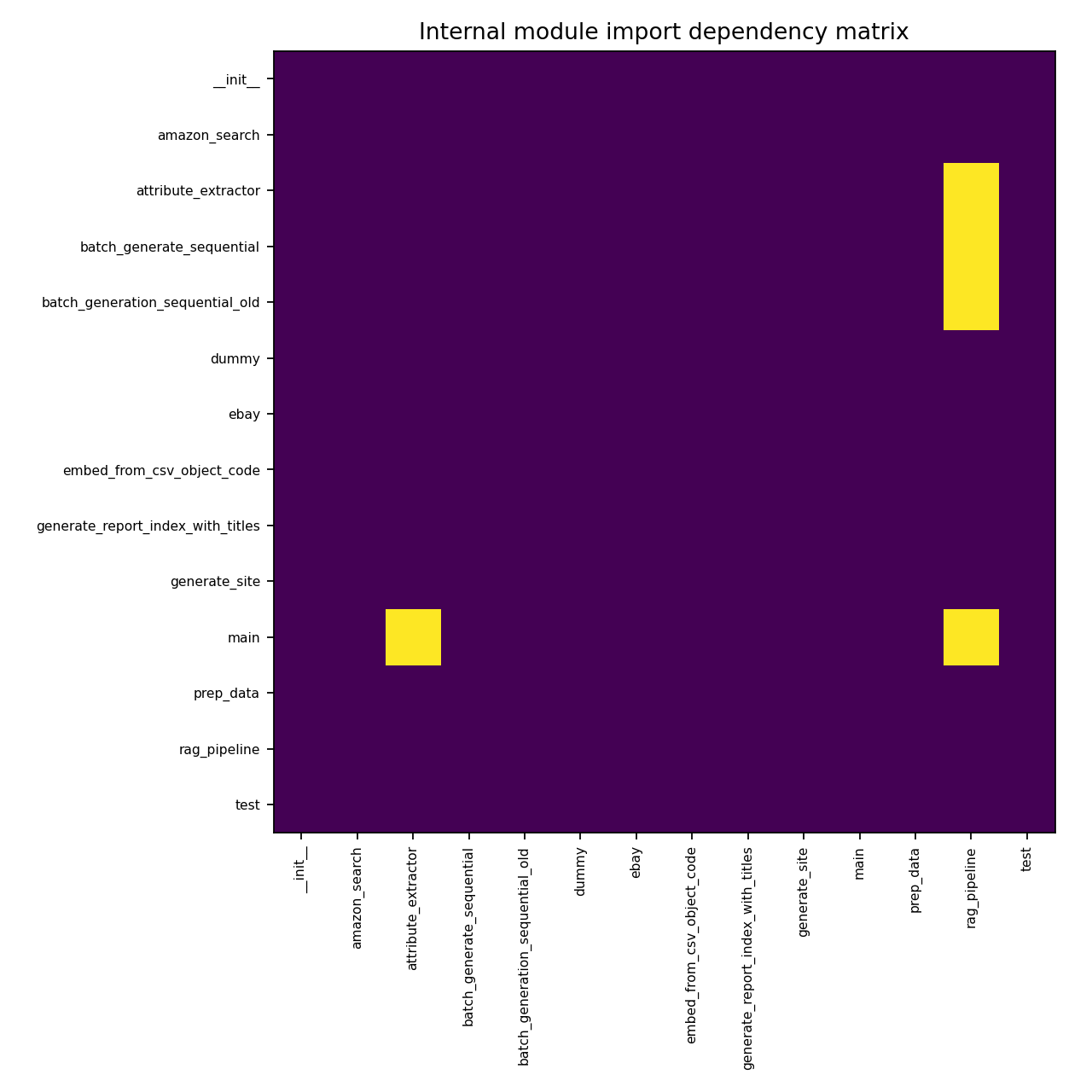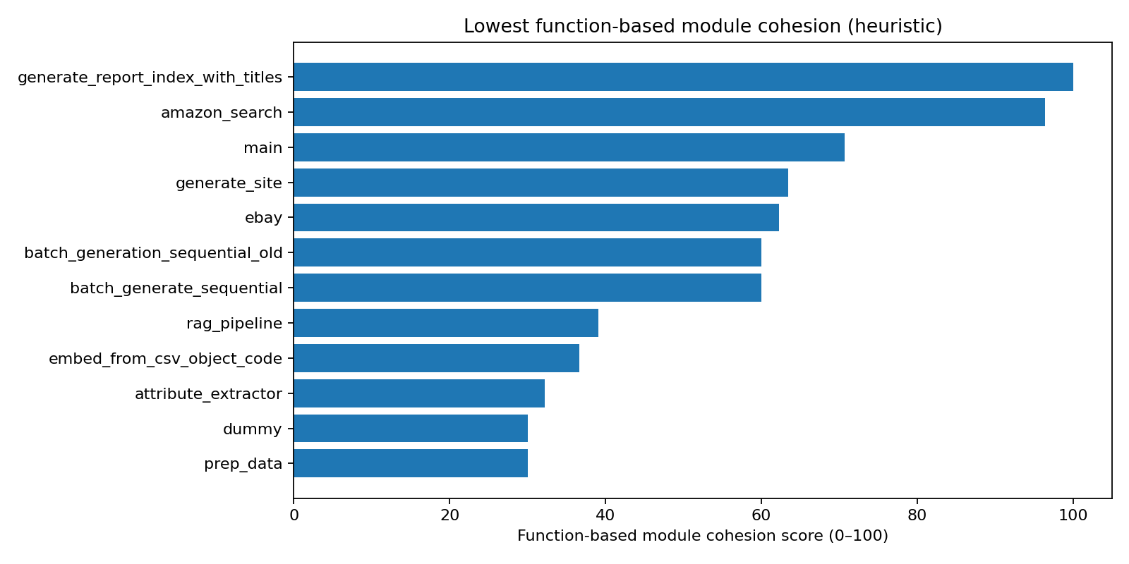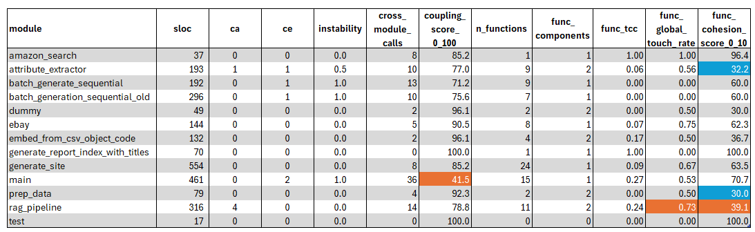 At a high level, the run indicates low internal import coupling overall, with a small number of “hub-like” internal dependencies (especially the pipeline module), and mixed cohesion, where a handful of modules show evidence of multiple responsibilities or disconnected function clusters.