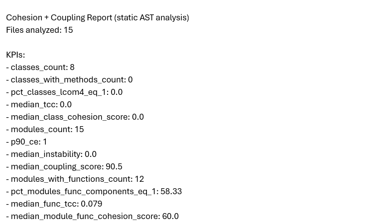 This appendix interprets the cohesion/coupling results from a static analysis run of a Python codebase. The design goal is high cohesion (each module focuses on a small, related set of responsibilities) and low coupling (modules minimize dependencies), because these attributes are associated with reduced maintenance effort and change risk (Tilley, 2025). Coupling measurement has a substantial research base and is commonly treated as an indicator tied to understandability and maintainability outcomes (Briand et al., 1999).
